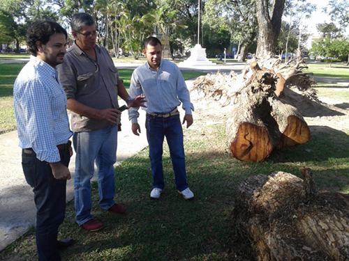 El Director de Cultura, Lic. Mariano H. Maciel junto al artista plástico goyano Nazareno Velázquez preparan una intervención artística sobre restos de un árbol que fue arrancado de raíz durante una fuerte tormenta en la Plaza San Martín de Goya.
