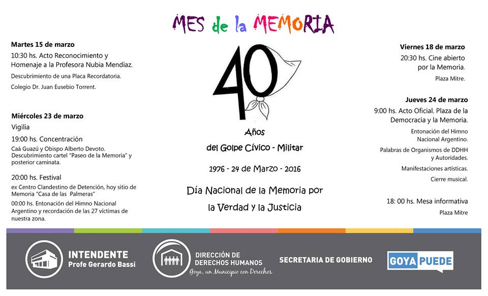 El “Mes de la Memoria” consiste en una serie de actividades organizadas desde la Municipalidad en el marco del 24 de marzo: Día de la Memoria por la Verdad y la Justicia. El acto central será el jueves.