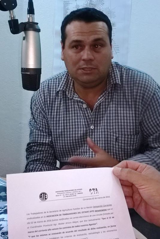 Como es sabido los trabajadores de Agricultura Familiar de la Nación -Delegación Corrientes-, fueron notificados de despidos hace pocos días por medio de una circular firmada por el Coordinador Provincial, Walter Arturo Alegre, enviada vía correo electrónico. Desde diversos estamentos municipales y provinciales se repudió esta medida arbitraria tomada por la nueva gestión presidencial.