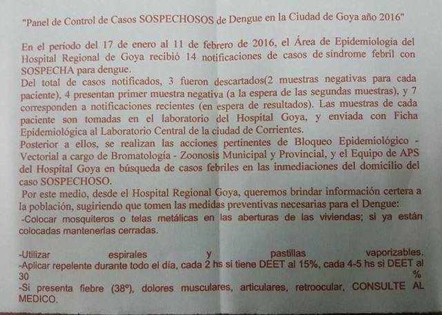 En el periodo del 17 de enero al 11 de febrero de 2.016, el Área de Epidemiologia del Hospital Regional de Goya recibió 14 notificaciones de casos de síndrome febril con sospecha para dengue.Del total de casos notificados, 3 fueron descartados (2 muestras negativas para cada paciente), 4 presentan primer muestra negativa (a la espera de las segundas muestras), y 7 corresponden a notificaciones recientes (en espera de resultados).