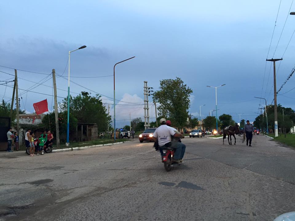 Alrededor de las 5,30 bomberos voluntarios tomo conocimiento de un siniestro vial sobre ruta a la altura del km 794, esto es en cercanía al santuario de SANLA. Al llegar al lugar se encontraron dos personas lesionas las que fueron identificadas como Escobar Fernando y Contreras Natalia quienes circulaban a bordo de una motocicleta 110 dominio 686 KOQ . El conductor del rodado del que emanaba aliento etílico informo a los presentes que se le había cruzado un caballo. Asistieron a la victimas, efectivos policiales de Cria 4ta, bomberos voluntarios, ambulancia y personal de transito.