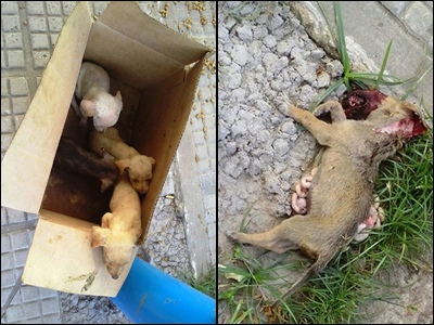 Dejaron cachorritos en una caja y algunos fueron aplastados por autos
