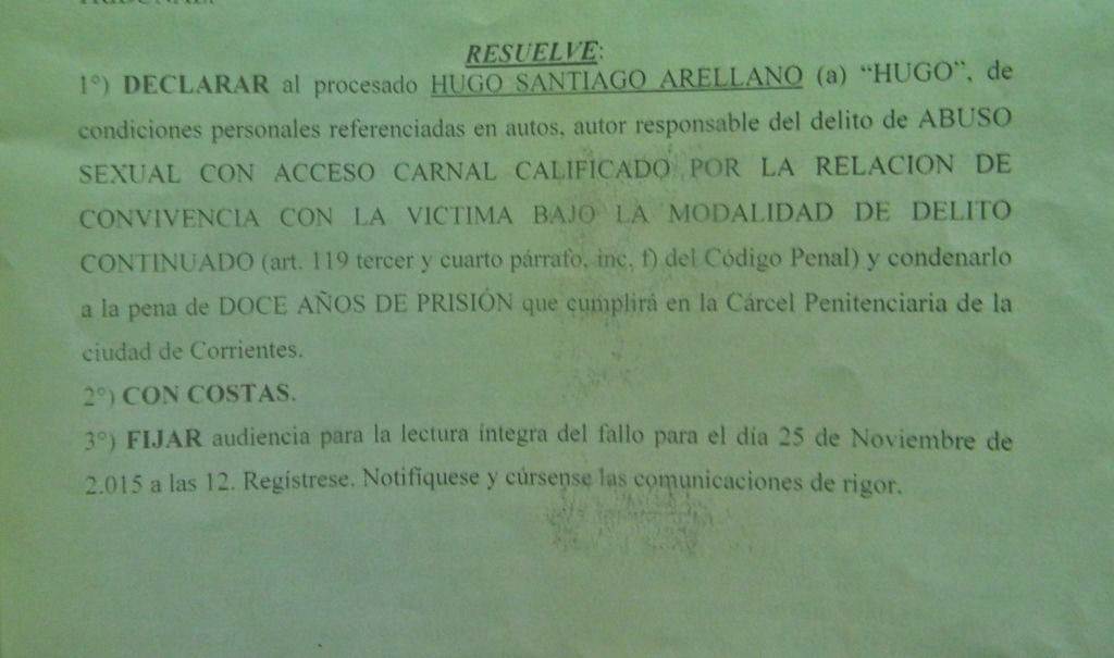 El Tribunal Oral Penal de Goya condenó a 12 años de prisión a Hugo Arellano, al hallarlo culpable del delito de abuso sexual desde los 8 a 13 años a una menor. Expediente 8766; Resuelve “Declarar al procesado Hugo Arellano de condiciones personales referenciadas en autos, autor responsable del delito de ABUSO SEXUAL CON ACCESO CARNAL – CALIFICADO POR LA RELACIÓN DE CONVIVENCIA CON LA VÍCTIMA – BAJO MODALIDAD DE DELITO CONTINUADO (art. 119, tercer y cuarto párrafo, inciso f del Código Penal) y Condenarlo a la PENA DE DOCE DE PRISIÓN que cumplirá en la Carcel de Penitenciaria de la ciudad de Corrientes. COPIA DEL FALLO