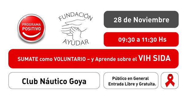 La Secretaría de Desarrollo Humano de la Municipalidad apoya a la Fundación Ayudar que por medio de su Programa Positivo, destinado a la prevención, educación, formación, contención y testeo en VIH, brindarán una Charla de Prevención y Formación en VIH a realizarse enel Club Náutico Goya (Ej. Argentino 900) el 28 de noviembre de 09:30 a 11:30, destinado al público en general con entrada libre y gratuita. Continuará el martes 1 de diciembre