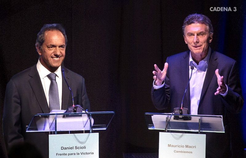 Los candidatos presidenciales Daniel Scioli (Frente para la Victoria) y Mauricio Macri (Cambiemos) protagonizaron esta noche un histórico debate de cara al balotaje del 22 de noviembre en el que el gobernador bonaerense se centró en difundir las propuestas que anunció en el marco de la campaña electoral y el jefe de Gobierno porteño reiteró cada vez que pudo que sus planes no implican la vuelta al pasado.