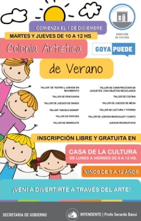 La Dirección de Cultura de Goya, que preside el Lic. Mariano H. Maciel, a partir del día de la fecha abre la inscripción para una nueva edición de la “COLONIA ARTÍSTICA DE VERANO”, que comenzará sus actividades el día martes 1 de diciembre, y durará todo el verano, para que los niños disfruten y aprendan durante sus vacaciones.
