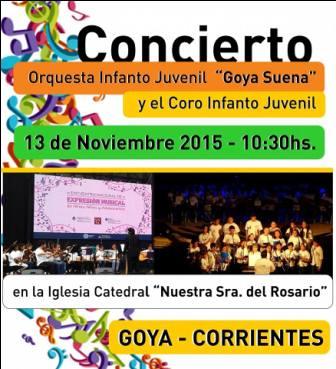 El viernes 13 de noviembre, a las 10:30 hs de la mañana, en la Iglesia Catedral “Nuestra Sra. del Rosario”, la Orquesta Infanto Juvenil “Goya Suena”, dirigida por el Lic. Mariano H. Maciel, y el Coro Infanto Juvenil, dirigido por la Prof. Selva Vera, brindarán un recital, como corolario y muestra del gran trabajo y enorme esfuerzo realizados durante todo el año.