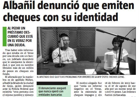 El caso del goyano Juan Carlos Núñez, que denuncio el uso de su identidad por otra persona y así emitir cheques sin fondos, repercutió en medios provinciales, uno de ellos es DIARIO NORTE, quien reflejo la noticia que se publicó en TNGOYA.COM el día miércoles.
