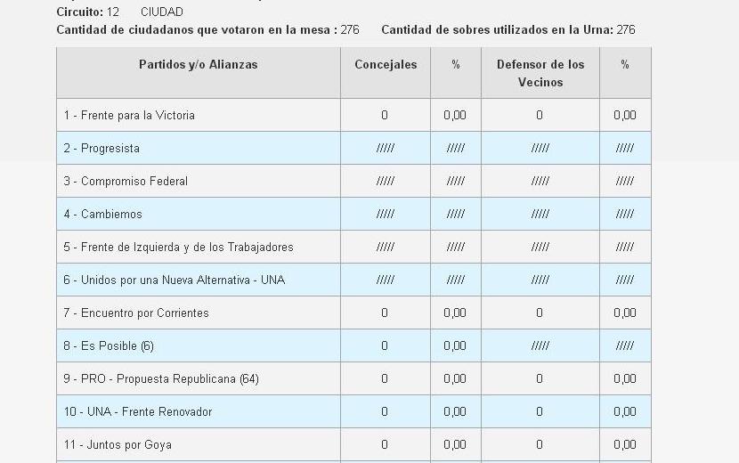 La banca número siete hasta el momento no tiene nombre, se la disputan Federico Tournier del partido encuentro liberal de Perucho Cassani y Darío Zapata que ahora estaría en Proyecto Corrientes dependiendo de Gustavo Canteros actual vice gobernador. La pelea se dará a partir del jueves donde se realizara el escrutinio definitivo. Lo cierto es que nada está dicho ya que hay tres certificados que no fueron cargados y que indicarían que Tournier sacaría una pequeña ventaja a su favor. Esta imagen tomada de la página oficial de la justicia de Corrientes confirma la ausencia de carga datos oficiales.