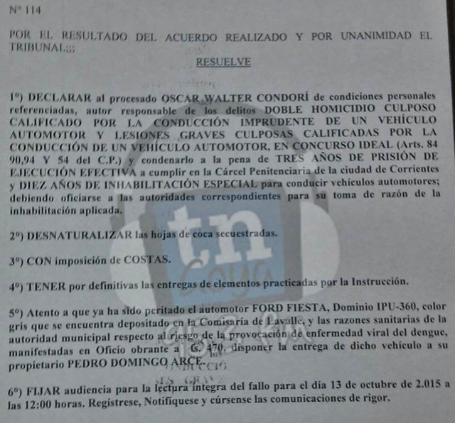 El condenado mato a dos personas en un accidente que ocurrió en Lavalle Corrientes. PARTE DE LA COPIA DEL FALLO