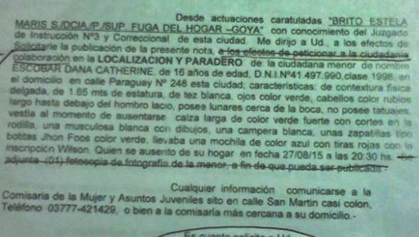 La menor Dana Catherin Escobar que se habría fugado de su casa el pasado 27 de Agosto, hasta el día de hoy, aún no aparece, en la mañana del sábado tome contacto con la progenitora Estela Britos y manifestó su gran preocupación por la desaparición, según una tía de Ezequiel el joven que sería novio de la menor, relato a la madre que estarían en otra ciudad, que ambos fueron en una motocicleta. “Ya informe a la justicia esta novedad, estoy muy preocupada mi hija está bajo tratamiento Psiquiátrico y necesita tomar medicación y no llevo nada, además debe ir al médico, espero alguien nos ayude y pueda volver a nuestra casa”, alego casi en llanto Estela Brito.