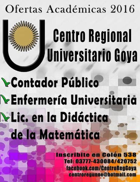 La Universidad Nacional del Nordeste informa que, a través del Centro Regional Universitario de Goya, se habilita la inscripción para cursar en esta ciudad las carreras que se dictan en el mismo, informó la Coordinadora Silvia Franco