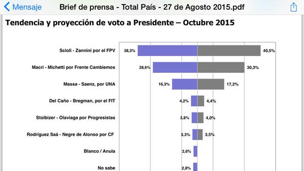 La fórmula integrada por Scioli y Carlos Zannini encabeza la intención de voto presidencial con el 40,5%; seguida por la dupla de Mauricio Macri y Gabriela Michetti con un 30,3%, según una encuesta de la consultora Aresco, publicada por Página/12. En tanto, el postulante del frente UNA, Sergio Massa, lograría el 17,2%. En Goya las encuestas dan a Scioli en un 65% de los votos aumentando su caudal electoral de las PASO.