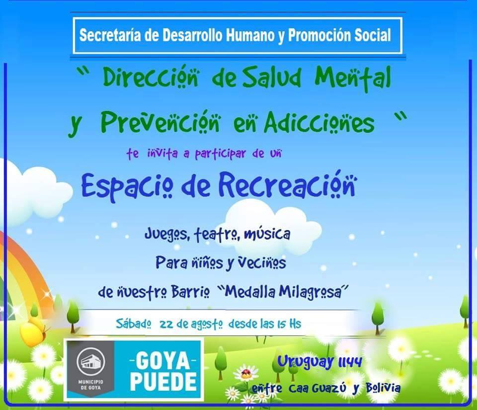 La Secretaría de Desarrollo Humano y Promoción Social a cargo de profesor Gonzalo Guido, y la Dirección de Salud Mental y Prevención en Adicciones, a cargo del licenciado Daniel Delguis y su equipo de trabajo, invitan a la comunidad goyana a las actividades en relación “al Mes del Niño”, que se realizarán el sábado 22 de agosto, desde las 15,00.