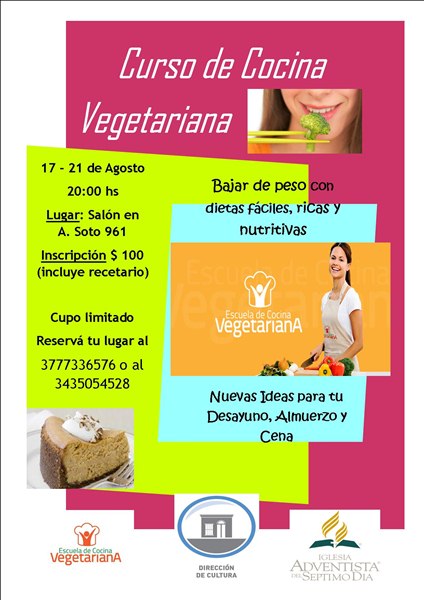 La Dirección de Cultura invita a la comunidad goyana a participar de un Curso de Cocina Vegetariana, que se llevará a cabo del 17 al 21 de agosto, en Ángel Soto 961 a las 20 hs, y que le dará nuevas ideas para el desayuno, el almuerzo y la cena, para ayudar a bajar de peso, y de esta manera beneficiar a la salud.