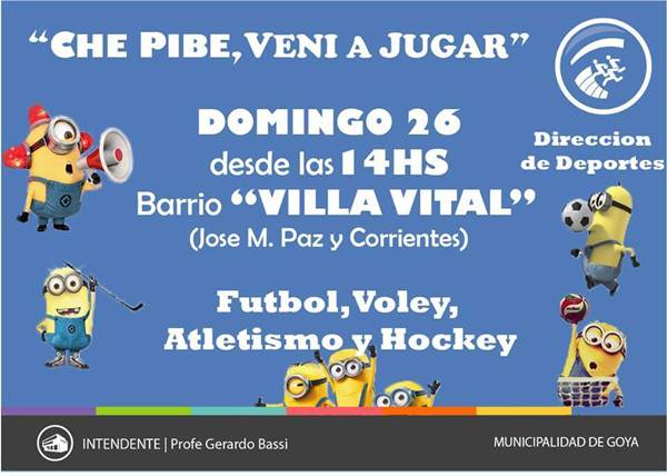 Este domingo 26 a partir de las 14:00 horas se desarrollará el 1er encuentro del año del “Che Pibe… Vení a jugar” organizado por la Dirección de Deportes de la Municipalidad de Goya. Los organizadores esperan la participación de más de 900 chicos que disfrutarán de futbol, vóley, hockey y atletismo. El evento deportivo-recreativo tendrá lugar en el espacio verde ubicado por José María Paz entre Corrientes y 9 de Julio.