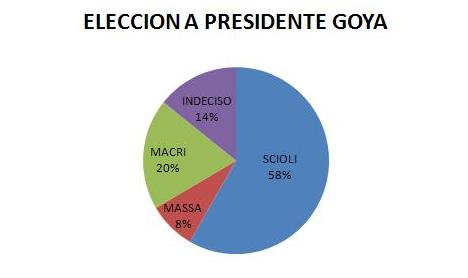 Según los últimos datos relevados por una consultora local, a través en la ciudad de Goya, la fórmula presidencial del Frente para la Victoria Scioli–Zannini logra de 38 puntos de ventaja sobre la del PRO Macri– Michetti. Massa con un 8% de intención de voto siendo superado hasta el momento por los indecisos que llegan al 14% de la población. La imagen positiva de la Presidenta Cristina Fernández de Kirchner en Goya alcanza el 81%, que sin dudas se refleja en la elección de Scioli Presidente.