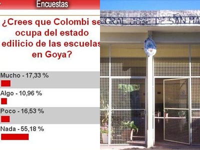 En una encuesta realizada por TNGoya, los lectores dejaron diariamente su voto, ante la pregunta: ¿Crees que Colombi se ocupa del estado edilicio de las escuelas en Goya?. Los resultados fueron contundentes, donde contestaron de la siguiente manera: Nada 55.18%, Poco 16.53%, Algo 10.96% y Mucho solo el 17.33%.