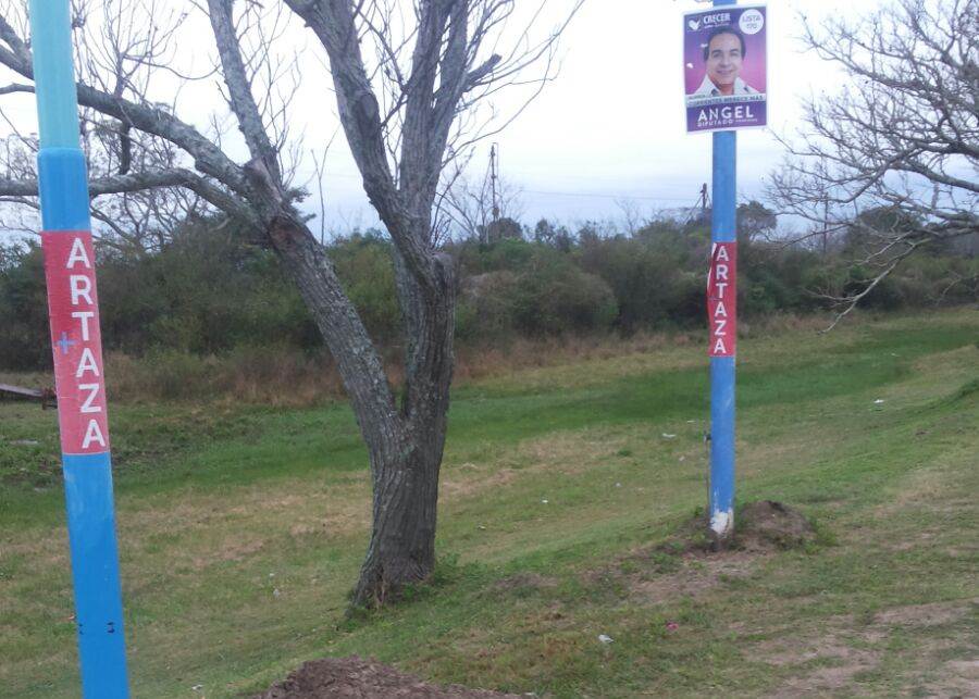 El acceso norte de la ciudad amanecio con carteles de campaña politica, como ser del candidato a diputado provincial Rodriguez y del senador nacional Artaza; los mismos pegaron sobre los nuevos postes de luminarias LED que aun no fueron inaugurados por el municipio.