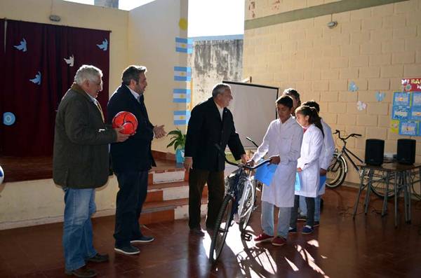 En un hecho que directivos, docentes y comunidad calificaron de histórico para el establecimiento educativo, el Intendente Gerardo Bassi participó del acto por el Día de la Bandera que se llevó a cabo en la Escuela Nº 865 de Paraje Las Mercedes de la Tercera Sección Rural de Goya. El Jefe Comunal tomó el juramento a los alumnos de 4º Grado y llevó bicicletas, elementos deportivos y guardapolvos para los chicos.