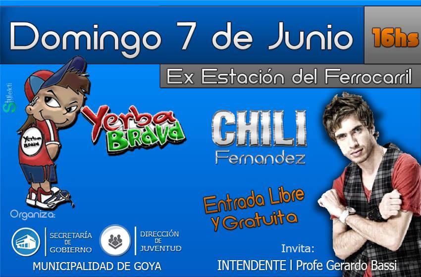 La Dirección de Juventud en conjunto con la Secretaría de Gobierno, se encuentran organizando un gran festival de música tropical con la actuación en vivo de “El Chili” Fernández y “Yerba Brava”. La invitación es para el domingo 7 de junio a partir de las 16:00 en el predio del Ex Ferrocarril